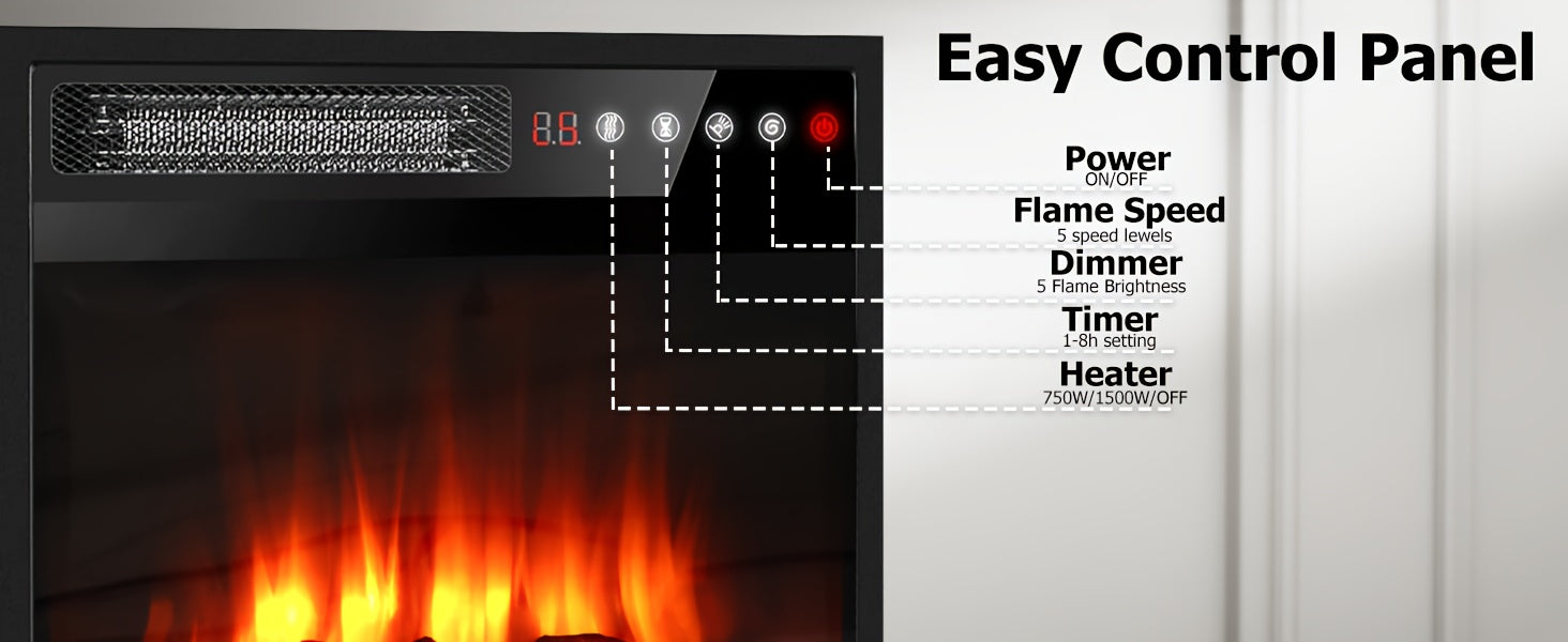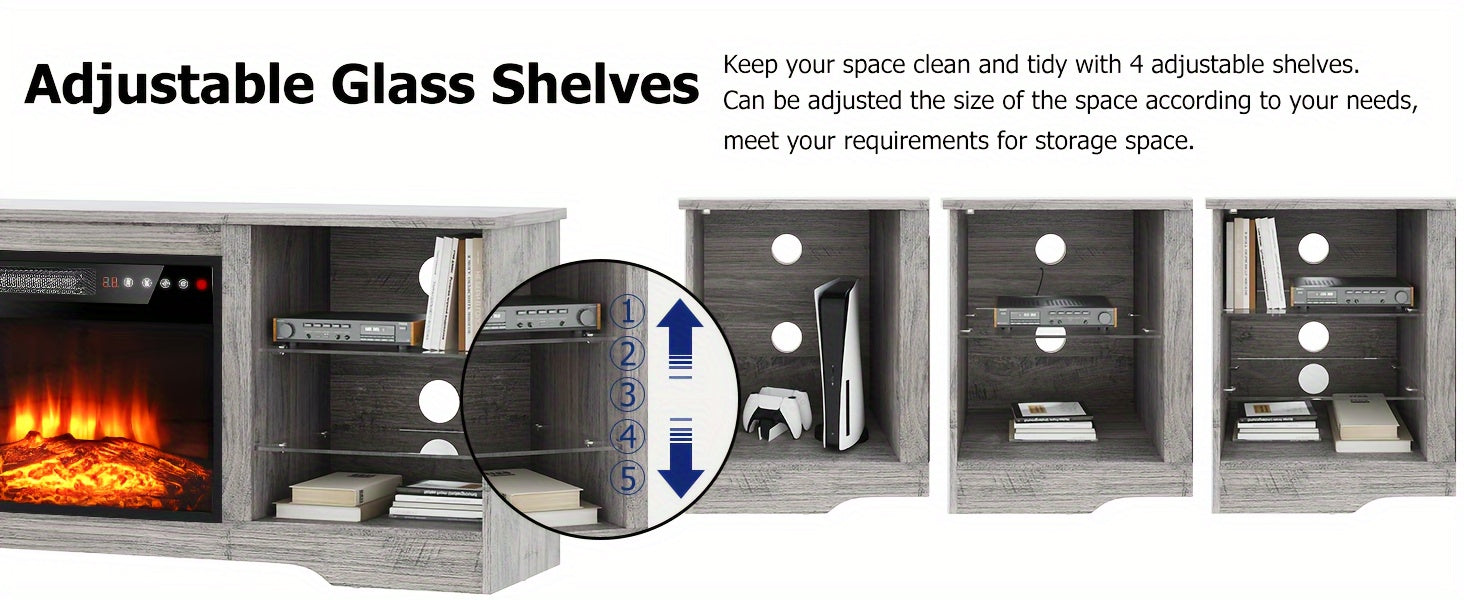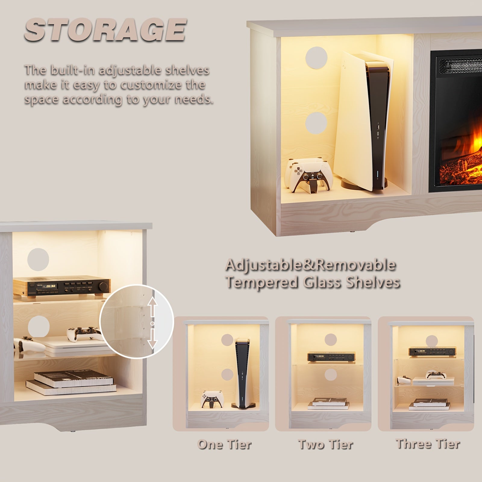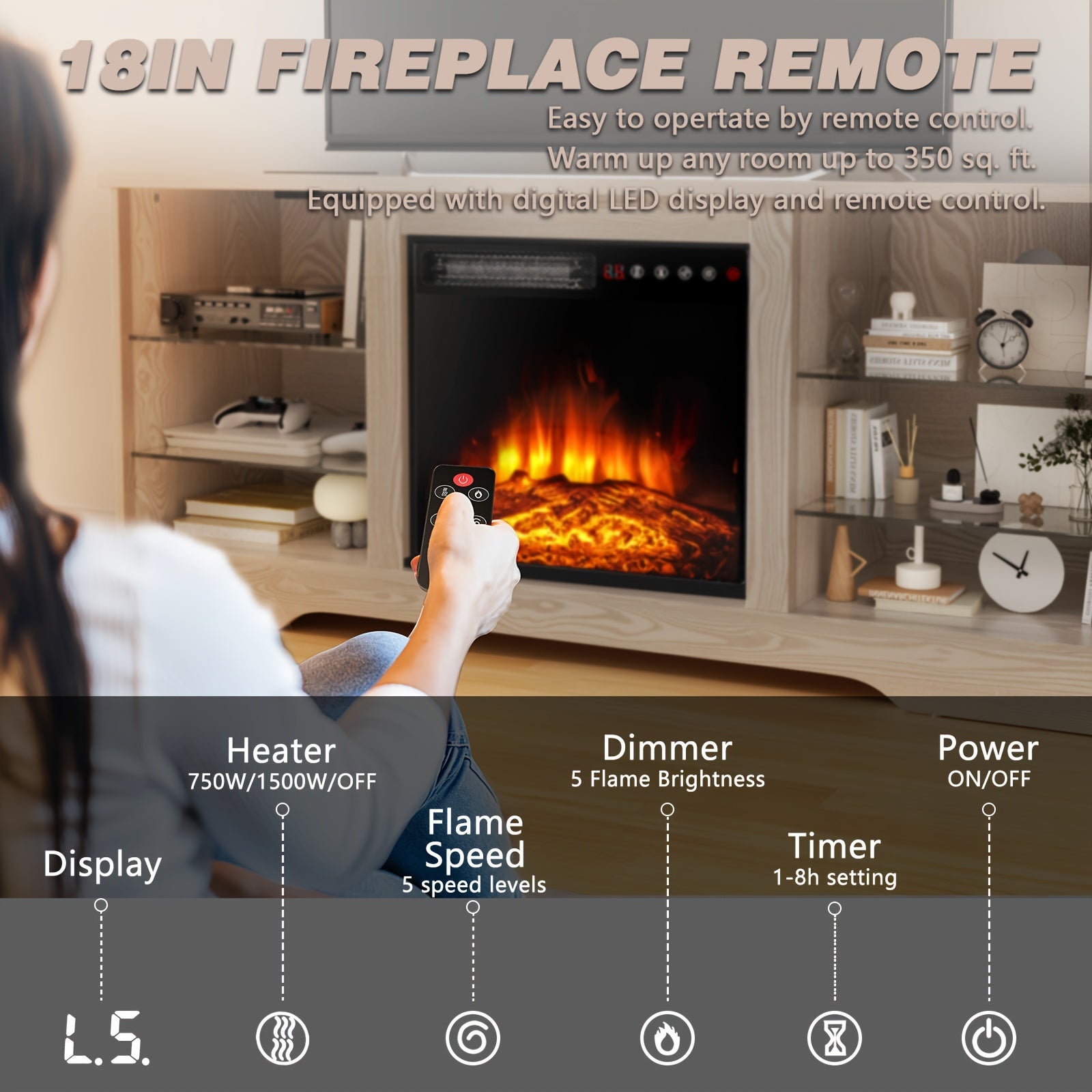 OFIKA 58 Inches Fireplace TV Stand for TVs up to 65 Inches Console with 18'' Electric Fireplace & Remote, Wooden Modern Entertainment Center for Living Room with LED Light Glass Shelves
