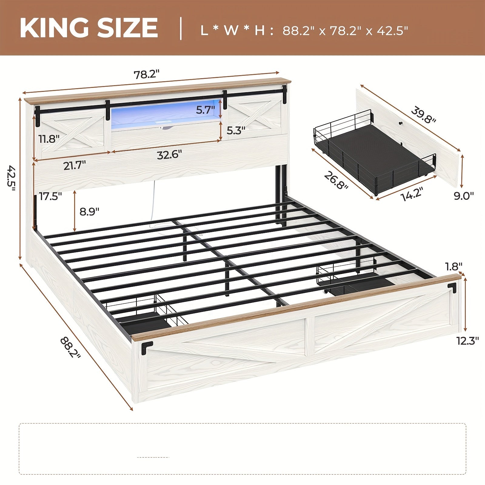 Queen/King/California King Farmhouse Bed Frame With LED Lights And Charging Station, Rustic Platform Bed Frame With 2 Storage Drawers And Headboard, White