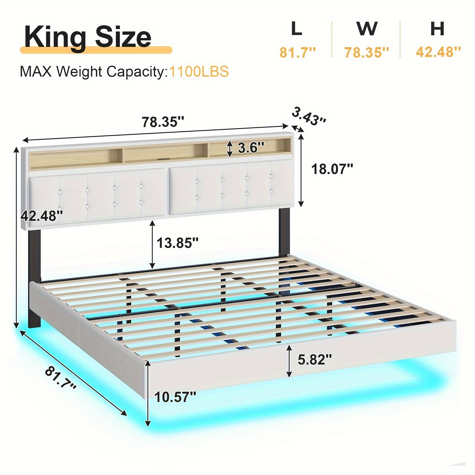 Queen/King Floating Bed Frame With LED Lights&USB Ports, Linen Queen/King Floating Platform Bed With Storage Headboard, No Box Spring Needed, Beige