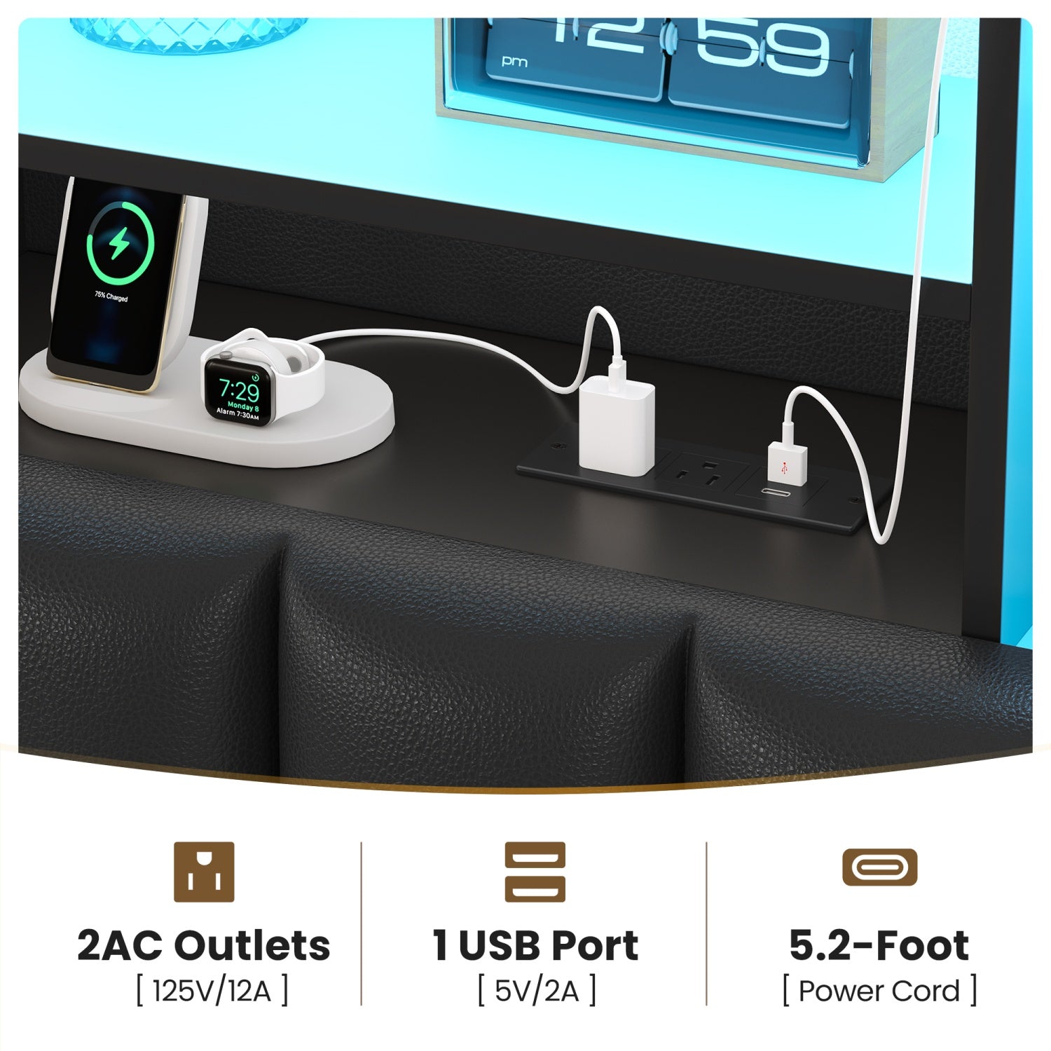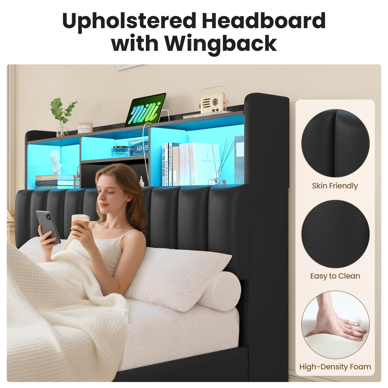 Queen Size Storage Bed Frame with LED Lights and Charging Station | Modern Upholstered Bed, Faux Leather, Bookcase Headboard, Drawers, Metal Slats, No Box Spring Needed, Black
