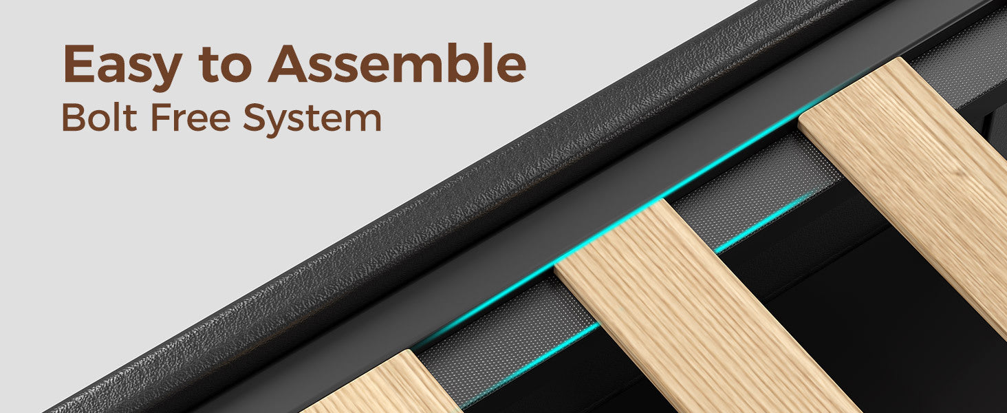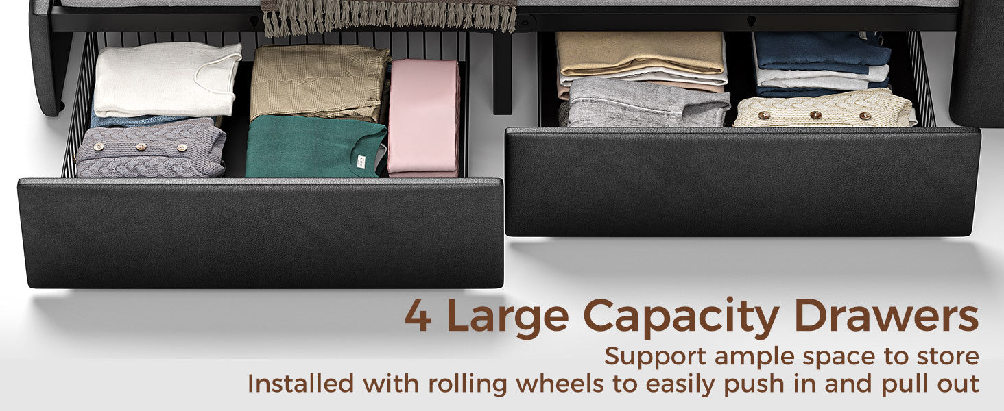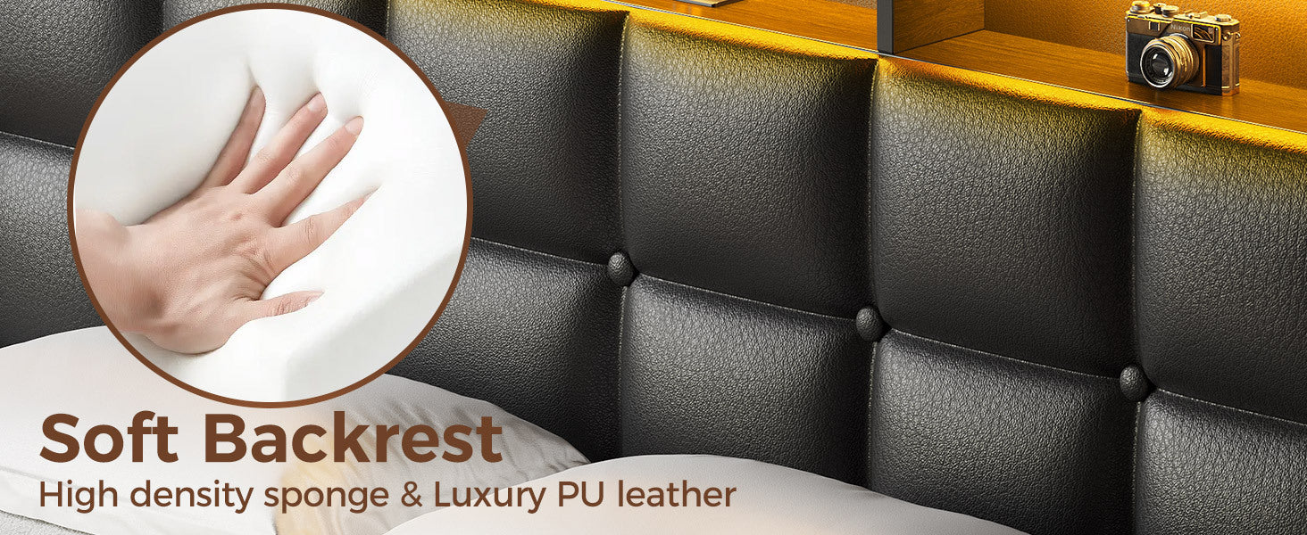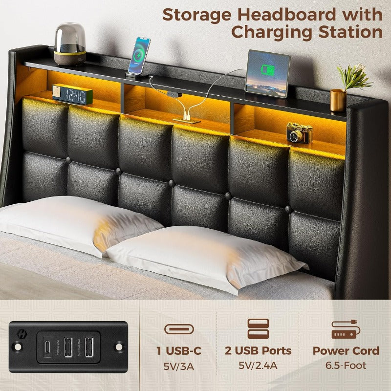 Twin Full Queen Bed Frame with LED Lighting, Built-in Charging Station, have RemotePU Leather/neutral-toned linen fabric Storage Headboard & Drawers,Heavy Duty Wood Slats, Quick & Easy Assembly - Perfect for Bedroom Furniture