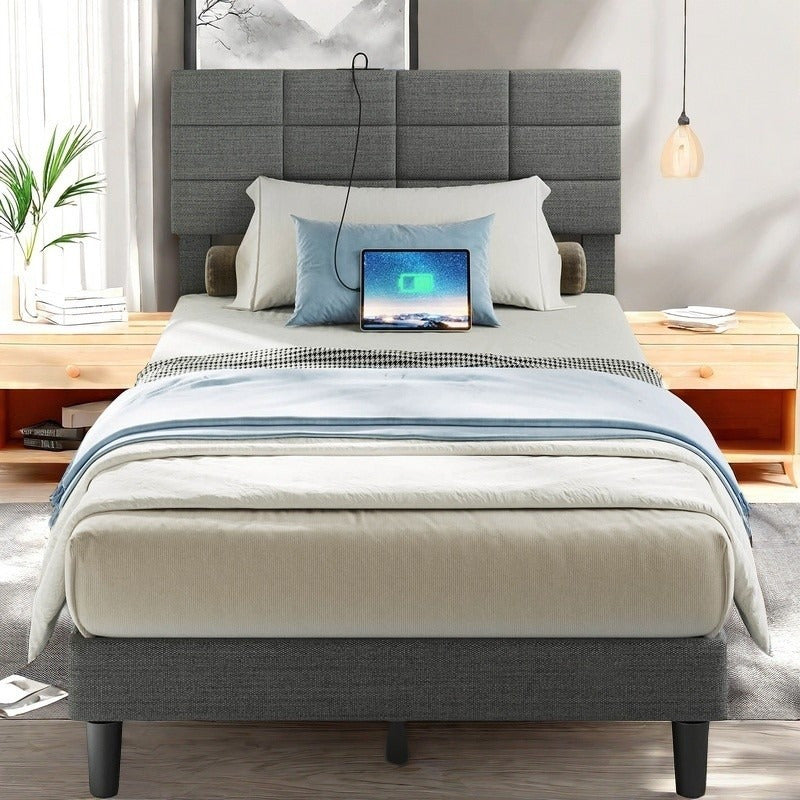 Twin/Full/Queen/King Size Platform Bed Frame with Fabric Upholstered Headboard and Wooden Slats Support, Leather Upholstered Headboard, and Built-in Charging Station, Upholstered Mattress Foundation/No Box Spring Needed/Easy