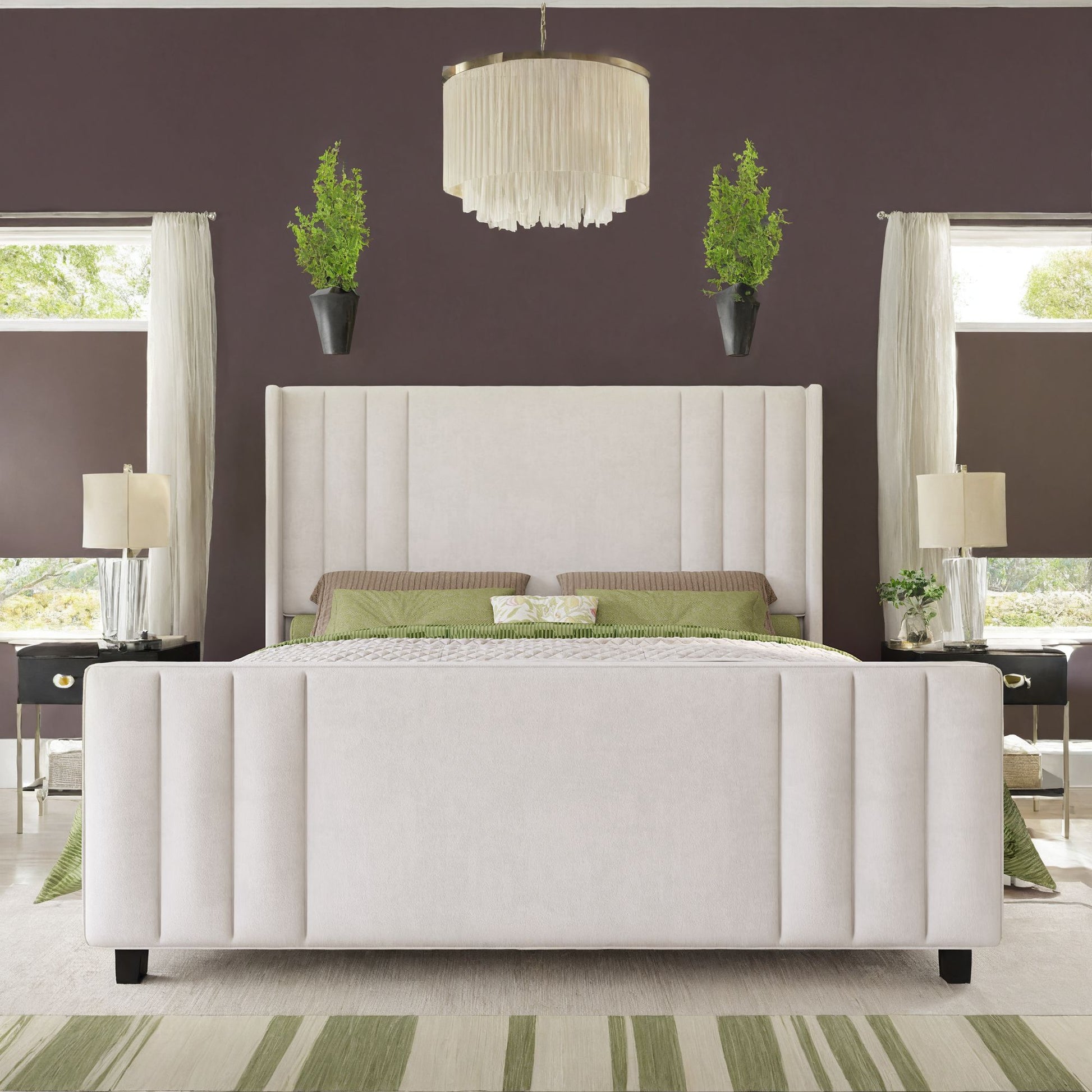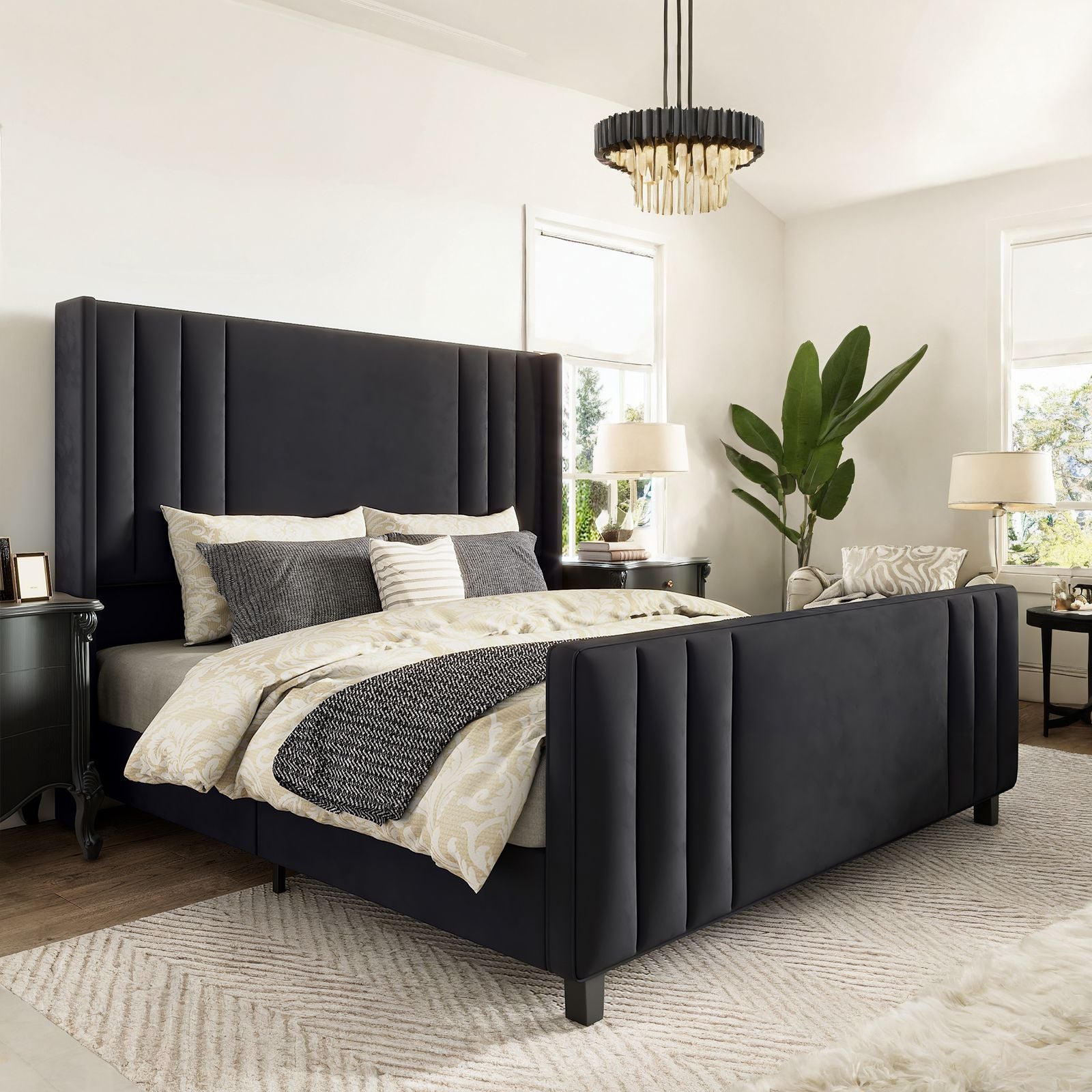 Velvet Upholstered Platform Bedstead with Vertical Channel Tufted Headboard, Footboard and Wingback, Wood Slats Mattress Groundwork, No Box Spring Necessary